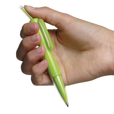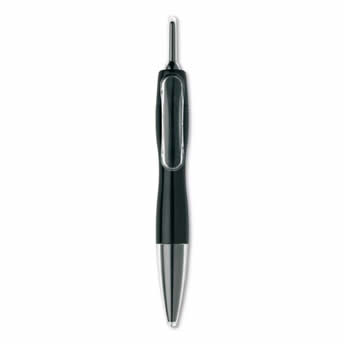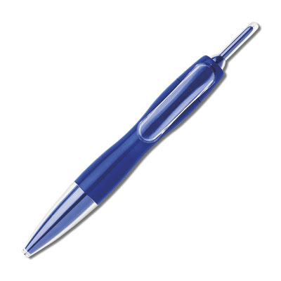 Deze trendy balpen heeft een drukmechanisme dat in alle richtingen kan geduwd worden. Werkt stressverlagend. Vervaardigd in een combinatie van transparante en gekleurde kunststof delen. Formaat: 13,8 x 2 x 1,9 cm.minimaal instelkosten 17,-